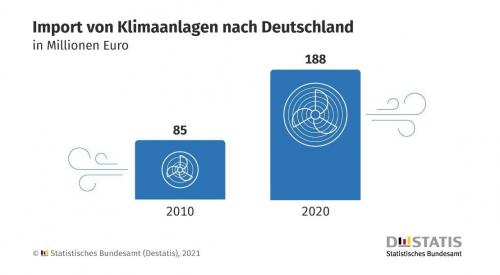 Der Import von Klimaanlagen hält an: Der Wert der nach Deutschland eingeführten Geräte stieg laut Statischem Bundesamt (Destatis) 2020 um 28 % verglichen zum Vorjahr.