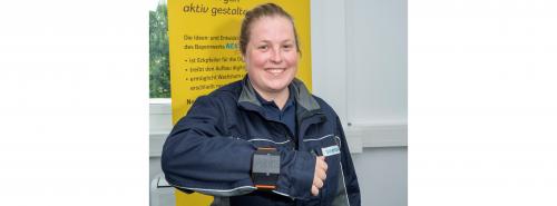 Stolz zeigt Bayernwerk-Servicetechnikerin Anna Goldbrunner im Sommer 2021 im Kundenzentrum Penzberg ihr neues Stromwarn-Wearable Marke Peek Quelle: Bayernwerk/Ekkehard Winkler, Winklerbild |