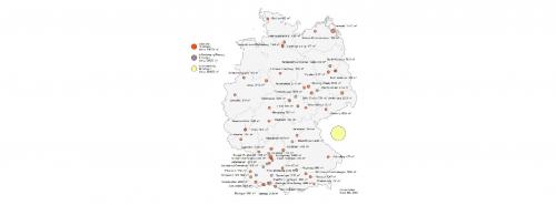 49 solare Wärmenetze mit insgesamt 146.204 Quadratmetern Bruttokollektorfläche sind im März 2023 in Deutschland in Betrieb. Zur Vollansicht bitte auf die Grafik klicken Quelle: Steinbeis Forschungsinstitut Solites |