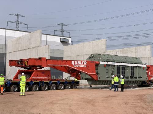 Tonnen schweren Trafos für den Konverter an der Höchstspannungs-Gleichstrom-Übertragungsleitung (HGÜ) Südostlink vor dem Umspannwerk Wolmirstedt bei Magdeburg angeliefert. Auf dem Foto steht er vor einer der beiden im Bau befindlichen Konverterhallen. Südostlink soll von 2027 an Windstrom von der deutschen See über Sachsen-Anhalt verlustarm per Gleichstrom nach Bayern transportieren. Zuerst gelangte der Trafo-Trumm von Nürnberg aus per Schiff nach Magdeburg, dann auf der Schiene nach Wolmirstedt und die letzten 150