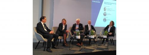 Diskussion auf dem VKU-Netzeforum: (v.li.) Ingbert Liebing (VKU), Barbie Kornelia Haller (Bundesnetzagentur), Moderator Rainer Stock (VKU), Staatssekretär Philipp Nimmermann (BMWK) und Rebecca Reischuk (SW Bielefeld) Quelle: E&M / S.Harmsen |