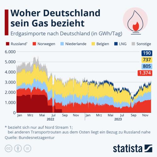 Russland hat vor einem Jahr seine Erdgasexporte nach Deutschland über die Nord Stream 1 Pipeline systematisch gedrosselt und Ende August 2022 vollständig eingestellt. Wie die Statista-Grafik mit Daten der Bundesnetzagentur veranschaulicht, setzt Deutschland seitdem auch auf im Importe von Flüssiggas. Mengenmäßig stellen die LNG-Importe aus Norwegen, den Niederlanden und Belgien jedoch den größten Anteil dar. Norwegen ist aktuell (Stand: 21. Dezember 2023) die wichtigste Erdgasbezugsquelle für Deutschland.