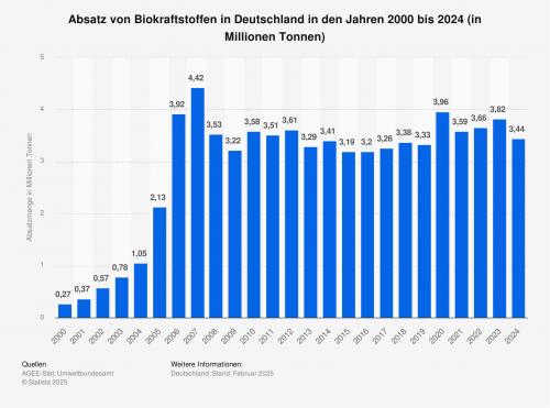 Die Statistik bildet die Entwicklung der Absatzmenge von Biokraftstoffen in Deutschland in den Jahren 2000 bis 2024 ab. Im Jahr 2024 wurden rund 3,44