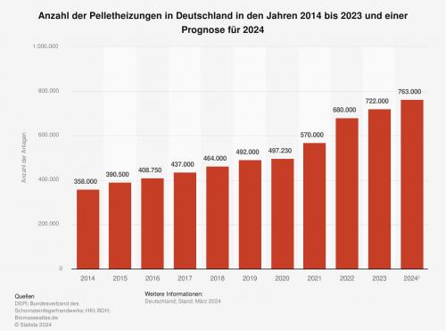Die Statistik zeigt die Entwicklung der Anzahl von Pelletheizungen in Deutschland in den Jahren 2014 bis 2023 und einer Prognose für 2024 (sieh hoch gestellte 1). Für das Jahr 2024 wird ein Bestand von rund 763.000 Pelletheizungen in Deutschland prognostiziert. Die Zahlen basieren auf Angaben des Bundesverbandes der Deutschen Heizungsindustrie (BDH), der DEPI