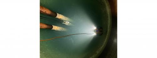 Das Mini-ROV (Remotely Operated Vehicle) ist im Monopfahl an einem Kabel abgelassen worden und strahlt im Wasser den maritimen Bewuchs von Stahlsäulen an. Quelle: Omexom |
