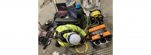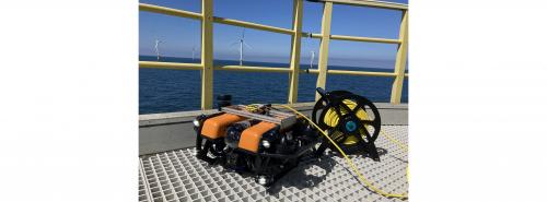 Ein Mini-ROV (Remotely Operated Vehicle) auf der untersten Plattform einer Offshore-Windenergieanlage. Von dort wird es dann im Inneren des Monopfahls bis in die Wassersäule hinein abgelassen Quelle: Omexom |