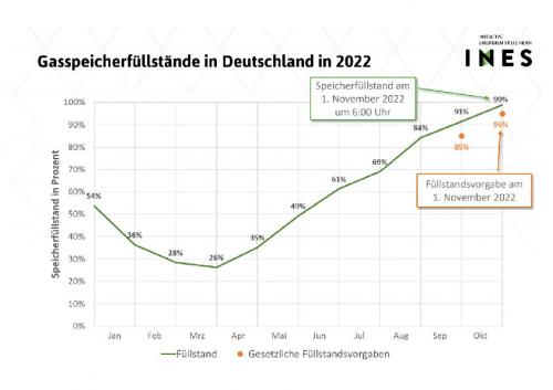 Mit vollen Speichern in den WinterPositiv wirkte sich in dieser Situation der temperaturbedingt niedrige Gasverbrauch in den Monaten Januar bis August auf. Das ermöglichte trotz aller Probleme umfangreiche Einspeicherungen. Die Füllstandsvorgaben, die dieses Jahr vom Gesetzgeber erlassen worden waren, konnten wesentlich früher als vorgeschrieben erreicht werden: So waren es am 1.