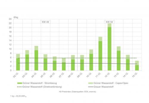 | H2-Preisindex für die Kalenderwochen 49 und 50 (zur Vollansicht bitte auf die Grafik klicken) Quelle: enervis energy advisors GmbH / EEX |