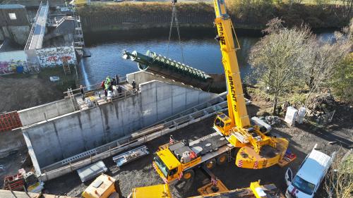 Der künstliche angelegte Bachlauf an der Ruhr und die 35-stufige Fischtreppe auf der Kiebitzwiese − einem Naturschutzgebiet der Stadt Fröndenberg in Nordrhein-Westfalen − sind schon länger fertig. Ende November lieferten zwei Sattelschlepper die Maschinenteile der noch fehlenden Turbinenschnecke samt Getriebe, Generator und Anbauteile. Ein 250-Tonnen-Kran brachte die 17