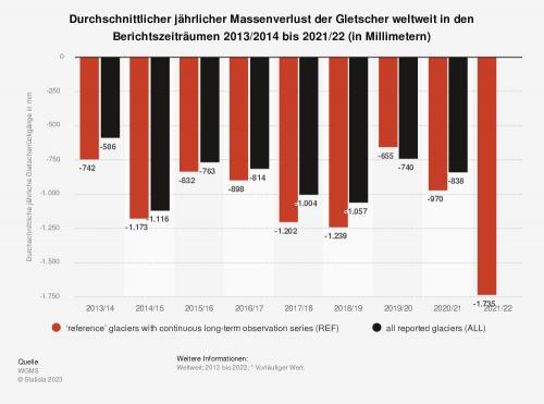 Die Statistik zeigt den Umfang der Gletscherrückgänge weltweit in den Jahren 2013 bis 2022. Im Jahr 2020/21 wurde demnach durchschnittlich ein Massenverlust der weltweiten Gletscher um knapp 0,8