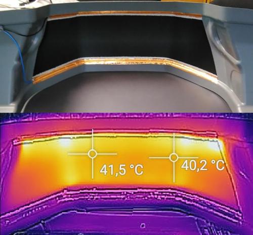 Der Prototyp der CNT-Heizung auf einem Armaturenträger (oben) und seine Heizleistung im Infrarotbild (unten) Bild: Osnatech |