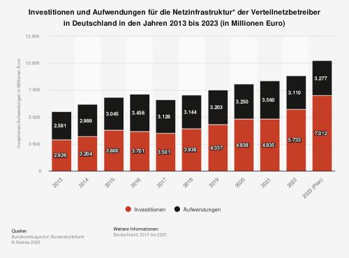 Die Statistik zeigt basierend auf Angaben der Bundesnetzagentur und des Bundeskartellamtes die Entwicklung der Investitionen und Aufwendungen für die Netzinfrastruktur der Verteilnetzbetreiber in Deutschland. Die Zahlen beziehen sich auf die Jahre 2013 bis 2023. Demnach planen die deutschen Verteilnetzbetreiber in diesem Jahr rund 7