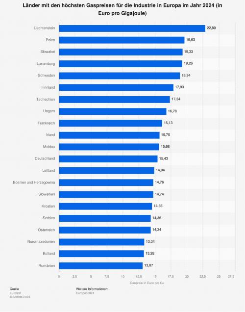 Im Jahr 2024 bezahlten industrielle Verbraucher laut Eurostat in Liechtenstein 22,89