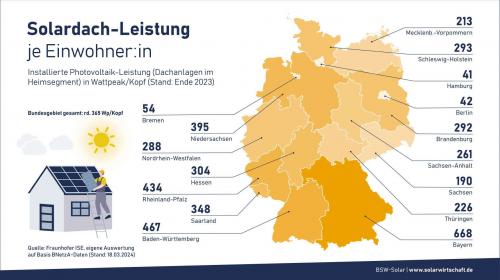 Bei der installierten Leistung von Photovoltaik-Dachanlagen im Heimsegment pro Einwohner gibt es laut dem Fraunhofer-Institut für Solare Energiesysteme (ISE) große regionale Unterschiede: Vorne liegen die Südländer Bayern und Baden-Württemberg mit 668