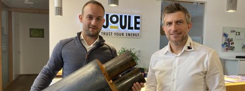 Kooperieren: Felix Schwahn von GP Joule (links) mit dem Modell einer Wärmeleitung und Jürgen Schuster von Corwese Quelle: GP Joule |
