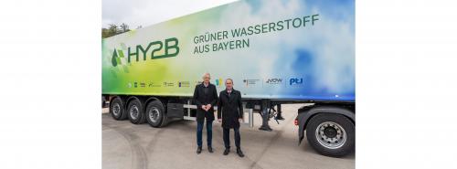 Tobias Brunner (Geschäftsführer Hy2B) und Hubert Aiwanger (Freie Wähler) vor einem Trailer, der den in Pfeffenhausen produzierten Wasserstoff zu Tankstellen transportieren soll Quelle: STMWi / Elke Neureuther |