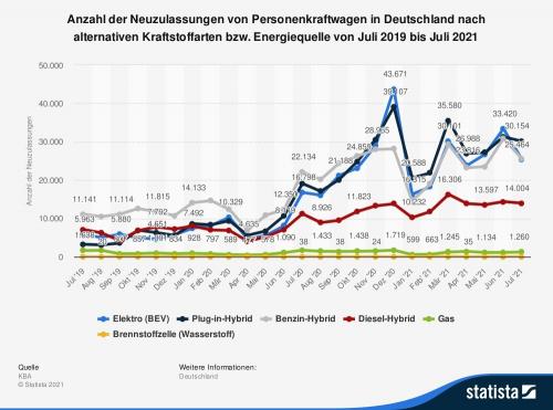 Basierend auf Daten des Kraftfahrtbundesamtes (KBA) zeigt die Grafik die Anzahl der Neuzulassungen von Personenkraftwagen in Deutschland von Juli 2019 bis Juli 2021 nach alternativen Kraftstoffarten. 38 der im Juli 2021 neu zugelassenen Autos in Deutschland wurden demnach mit einer Brennstoffzelle betrieben. Bei 30.200 handelte es sich um einen Plug-in-Hybrid.