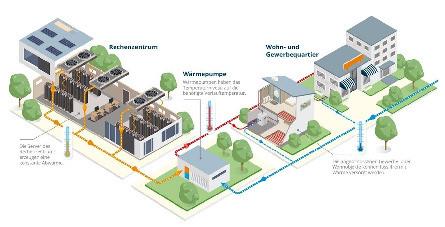 Grad warme Abluft aus dem Rechenzentrum durch drei Wärmepumpen mit einer Leistung von zusammen 5