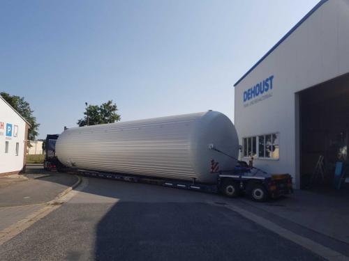 Wie Wärmewende vor Ort effizient umgesetzt werden kann, zeigt das Beispiel der österreichischen Firma Berglandmilch. Sie hat sich einen 152 Kubikmeter großen Wärmespeicher vom Hersteller Dehoust aus dem baden-württembergischen Leimen angeschafft. Das Bild zeigt, wie der Speicher auf einem Lkw ins oberösterreichischen Feldkirchen transportiert wird. Mit dem neuen Speicher kann die Wärme über eine sogenannte hydraulische Weiche unabhängig von der aktuellen Leistung des Biomasse-Heizwerks optimal im Produktionsprozess eingesetzt werden.