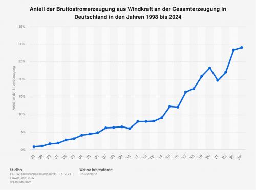 Prozent des gesamten Bruttostroms in Deutschland erzeugt. An Land befanden sich zuletzt über 28.500 Onshore-Anlagen, während in deutschen Gewässern rund 1.500 Offshore-Anlagen Strom in das Netz einspeisen. Die Angaben stammen vom Bundesverband der Energie- und Wasserwirtschaft (BDEW), dem Statistischen Bundesamt, der europäischen Energiebörse EEX, von VGB PowerTec und dem Zentrum für Sonnenenergie- und Wasserstoff-Forschung Baden-Württemberg (ZSW).