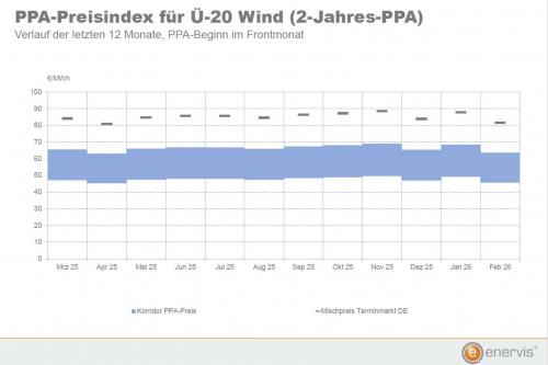 Die erzielbaren Preiskorridore für typische Strom-Direktlieferverträge aus Erneuerbare-Energien-Anlagen (PPA) haben sich in Deutschland im Februar 2026 − in Abhängigkeit vom Strom-Terminmarkt der Börse EEX − nach unten entwickelt. Das ergeben aktuelle Berechnungen des Analysehauses Enervis für den gemeinsamen PPA-Preisindex mit