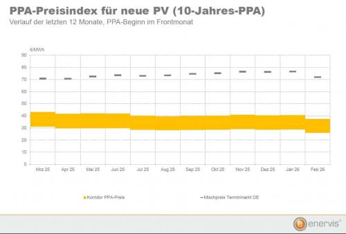 Für PPA auf neue Photovoltaik-Freiflächenanlagen mit zehnjähriger Stromlieferung mit einem Lieferstart im März 2026 lag der Preiskorridor im Februar zwischen 26