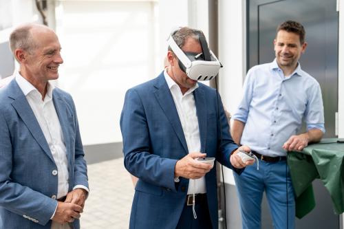 Umweltminister Glauber lässt sich mit einer VR-Brille die verschiedenen verfügbaren LED-Beleuchtungs-Versionen anzeigen. Links Bayernwerk-Vorstand Westphal, rechts Stadtwerke-Geschäftsführer Fiedler