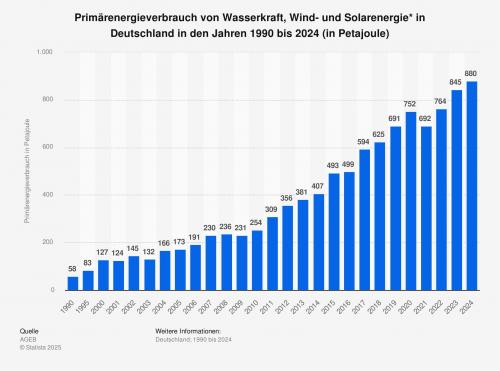 Die Statistik von Statista mit einer etwas irreführenden Grafiküberschrift stellt den nominellen Beitrag von Wasser- und Windkraft sowie Solarenergie in Deutschland in den Jahren 1990 bis 2024 zur Deckung des Primärenergieverbrauchs dar. Im Jahr 2024 betrug der Beitrag von Solarenergie, Wasser- und Windkraft in Deutschland 880