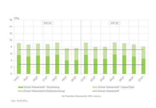 | H2-Preisindex für die Kalenderwochen 29 und 30 (zur Vollansicht bitte auf die Grafik klicken) Quelle: enervis energy advisors GmbH / EEX |