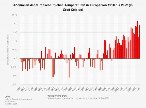 Im Jahr 2022 lagen die durchschnittlichen Temperaturen in Europa um 1,94 Grad Celsius über dem errechneten Temperaturdurchschnitt des Zeitraums von 1910 bis 2000. Das ist der zweithöchste Wert seit mindestens 1910. Nur im Jahr 2020 erreichten die Temperaturanomalien mit 2,17 Grad Celsius einen noch höheren Wert.