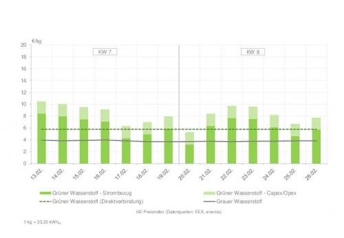 | Wasserstoffpreisindex für die Kalenderwochen 7 und 8 (zum Vergrößern bitte auf die Grafik klicken) Quelle: enervis energy advisors GmbH / EEX |