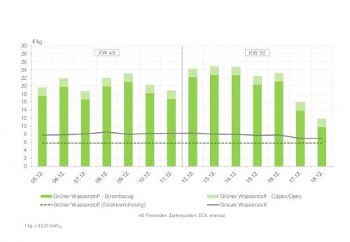 | Wasserstoffpreisindex für die Kalenderwochen 49 und 50 (zur Vollansicht bitte auf die Grafik klicken) Quelle: enervis energy advisors GmbH / EEX |