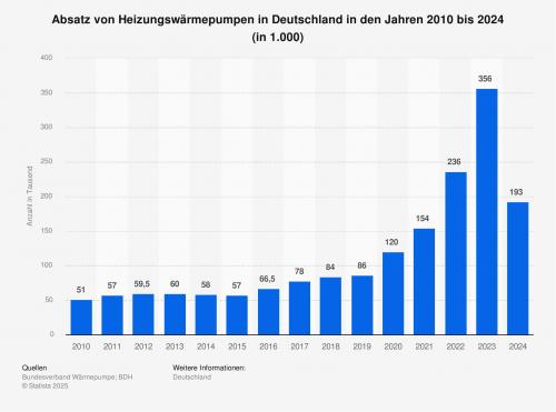 Die Statistik zeigt die Entwicklung der Absatzzahlen von Heizungswärmepumpen in Deutschland in den Jahren von 2010 bis 2024. Demnach wurden im vergangenen Jahr in Deutschland rund 193.000 Heizungswärmepumpen abgesetzt. Damit ging der Absatz um rund 46
