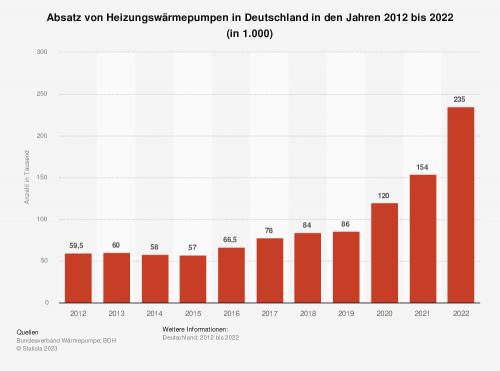 Die Statistik zeigt die Entwicklung der Absatzzahlen von Heizungswärmepumpen in Deutschland in den Jahren von 2012 bis 2022 nach Angaben des Bundesverbands Wärmepumpen. Im Jahr 2022 wurden in Deutschland rund 236.000 Heizungswärmepumpen abgesetzt. Zu den Heizungswärmepumpen gehören Luft/Wasser-Wärmepumpen sowie erdgasgekoppelte Wärmepumpen.