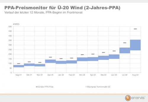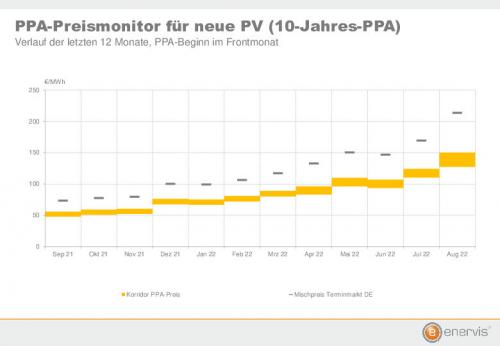 Die Rekordpreise im deutschen Strom-Terminmarkt haben im August auch die Marktpreise für Direktlieferverträge (Power Purchase Agreements, PPA) von alten Onshore-Windenergieanlagen und neuen Photovoltaik-Freiflächenanlagen auf ein bisher ungekanntes Niveau hochgezogen. Das ergeben Berechnungen des Analysehauses Enervis für den PPA-Preisindex mit
