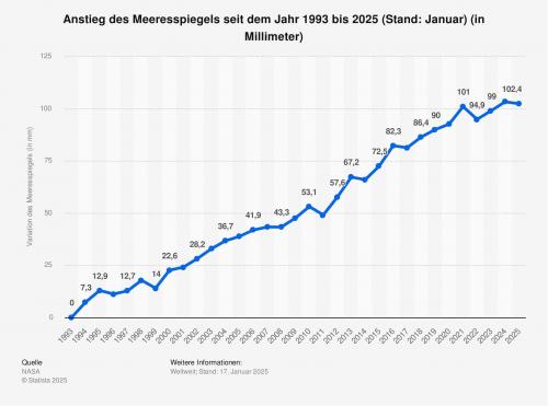 Gegenüber dem Jahr 1993 hat sich der Meeresspiegel, also das Höhenniveau der Meeresoberfläche, im Jahr 2025 um über zehn Zentimeter erhöht. Die Aufzeichnungen des Höhenniveaus wurden seitens der NASA erstmals im Jahr 1993 vorgenommen. Diese Erhöhung wird hauptsächlich durch zwei Faktoren, die mit dem Klimawandel zusammenhängen, verursacht: Zum einen das zusätzliche Wasser aus schmelzenden Eisschilden und Gletschern und die Ausdehnung von Meerwasser bei der Erwärmung der Erdoberfläche.