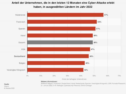 Eine weltweit durchgeführte Umfrage aus dem Jahr 2022 ergab, dass rund 46 Prozent der befragten Unternehmen in Deutschland mindestens ein Mal Opfer einer Cyber-Attacke geworden waren. Im Durchschnitt gaben rund 49 Prozent der befragten Unternehmen aus den verschiedenen Ländern an, in den vergangenen zwölf Monaten mindestens eine Cyber-Attacke erlebt zu haben.