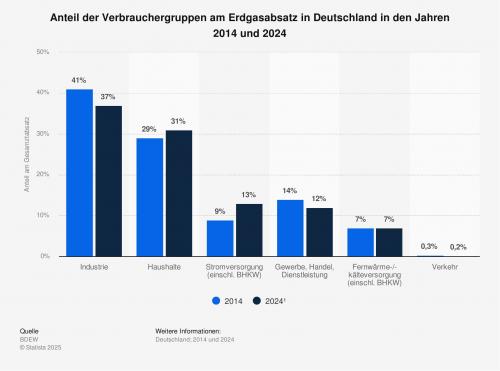 Milliarden kWh, die laut dem Bundesverband der Energie- und Wasserwirtschaft (BDEW) 2024 an Erdgas verbraucht wurden, entfielen etwa 37