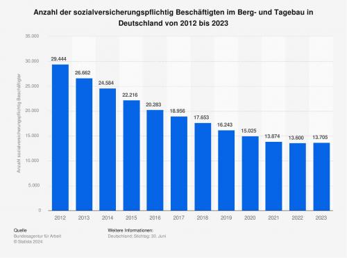 Die Statistik zeigt die Anzahl der sozialversicherungspflichtig beschäftigten Bergleute (Berg- und Tagebau) in Deutschland in den Jahren von 2012 bis 2023. Die Daten beziehen sich jeweils auf den Stichtag 30. Juni in den einzelnen Berichtsjahren und wurden auf Basis der Klassifizierung der Berufe von 2010 erhoben. Am 30. Juni 2023 gab es rund 13.700 sozialversicherungspflichtig Beschäftigte im Berg- und Tagebau in Deutschland.