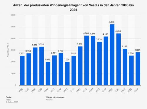 Im Jahr 2024 produzierte das dänische Unternehmen Vestas 2.837 Windkraftanlagen, die weltweit ausgeliefert wurden. Das waren rund 300 Anlagen mehr als im Vorjahr.