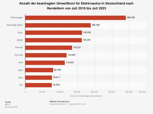 Bundesamtes für Wirtschaft und Ausfuhrkontrolle (Bafa) die Nummer eins bei den Anträgen für Kaufprämien von Elektroautos. Bis Juli 2023 belief sich die Anzahl beantragter Kaufprämien für Batterieelektro-, Plug-in-Hybrid-, oder Brennstoffzellen-Fahrzeuge des Wolfsburger Autobauers auf rund 290.000. Auf dem zweiten und dritten Rang folgten Mercedes-Benz und Tesla. Förderfähig ist der Erwerb (Kauf oder Leasing) eines Batterieelektro- oder Brennstoffzellen-Fahrzeugs, das einen Netto-Listenpreis des Basismodells von 65.000 Euro nicht überschreitet.