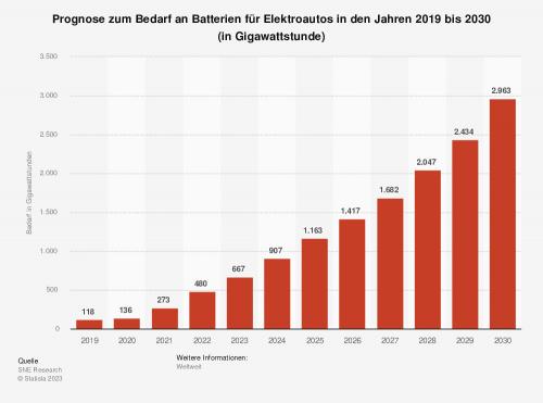 Rasantes Wachstum − laut SNE Research wird der Leistungsbedarf der Batterien für Elektroautos in den Jahren bis 2030 deutlich ansteigen. Der Bedarf soll demnach auf rund 3.000