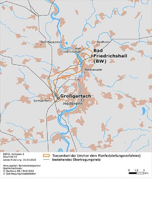 Das abgeschlossene Planfeststellungsverfahren der Bundesnetzagentur für den ersten Abschnitt des Suedlink bezieht sich auf das Erdkabel von Bad Friedrichshall zum Netzverknüpfungspunkt Leingarten-Großgartach (beides in Baden-Württemberg). Der Verlauf der neuen Stromleitung steht damit für diesen Abschnitt fest, und der Vorhabenträger für diesen Abschnitt, Transnet BW, kann mit dem Bau beginnen. Dies teilte die Behörde am 25.