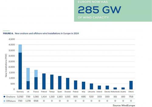 MW Zubau waren Großbritannien, Frankreich, Finnland, die Türkei, Spanien und Schweden. Der Anteil der Windenergie am Stromverbrauch Europas lag 2024 bei 20