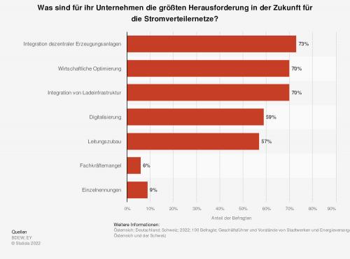 Prozent der Befragten an, dass die Integration dezentraler Erzeugungsanlagen eine der zentralen Herausforderungen für Stromverteilernetze werden wird. Dies ging aus einer Umfrage von BDEW und EY unter 100 Geschäftsführerinnen, Geschäftsführern und Vorständen von Stadtwerken und Energieversorgungsunternehmen aus Deutschland, Österreich und der Schweiz hervor.