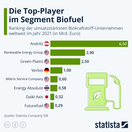 Unter den acht umsatzstärksten Biokraftstoff-Unternehmen der Welt befinden sich zwei europäische Unternehmen. Das zeigt die Infografik auf Basis von Daten der Statista Company DB. Auf Platz eins liegt demzufolge die Andritz AG mit Sitz in Österreich. Das Unternehmen ist unter anderem im Bereich der Energieerzeugung durch Biomassekraftwerke und der Biomasse-Pelletierung tätig.