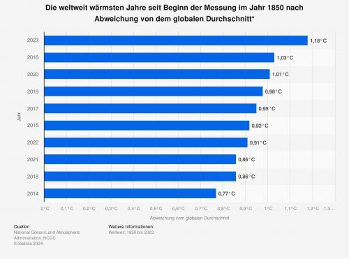 Das weltweit wärmste Jahr seit Beginn der Messungen im Jahr 1850 war das Jahr 2023 mit einer Abweichung von dem globalen Durchschnitt von 1,18 Grad Celsius. Aufgelistet werden die zehn wärmsten Jahre seit Beginn der Messungen. Von den insgesamt also 173 möglichen Jahren sind die zehn wärmsten Jahre nach Abweichung vom globalen Durchschnitt in den vergangenen zehn Jahren gewesen.