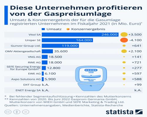 Nach deutlicher Kritik an der Gaspreisumlage hat Wirtschaftsminister Robert Habeck Anpassungen des Konzepts angekündigt. Laut eines Interviews mit dem Deutschlandfunk sollen nur Unternehmen, die einen großen Anteil an der Versorgung Deutschlands mit Gas und keine Ausgleichsmöglichkeit durch Übergewinne in anderen Segmenten haben, Anspruch erheben können. Außerdem sollen entsprechende Firmen keine Dividende und Boni auszahlen dürfen. Wie unsere Grafik zeigt, könnten durch diese Nachjustierungen einige der Unternehmen, die sich für die Gaspreisumlage registriert hatten, wieder aus dem Raster fallen.