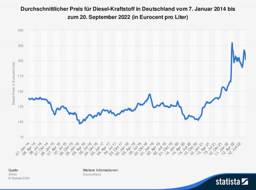 Cent. Der Krieg in der Ukraine und damit verbundene Unsicherheiten der stabilen Rohöl- und Erdgasversorgung treiben derzeit die Ölpreise, was dann zu deutlichen Preissprüngen und neuen Allzeithochs führte. Auch die Höchststände vom August 2012 und vom November 2021 wurden übertroffen. Im EU-Vergleich liegt der durchschnittliche Dieselpreis in Deutschland aktuell in der oberen Hälfte.