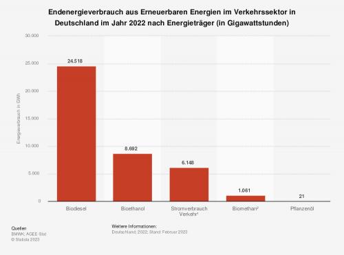 Die Statistik zeigt den Endenergieverbrauch aus Erneuerbaren Energien im Verkehrssektor in Deutschland nach Zahlen des BMWK und von AGEE Stat, aufgeschlüsselt nach Energieträger im Jahr 2021. Im genannten Jahr betrug der Verbrauch von Energie aus Bioethanol im Verkehrssektor rund 8,7